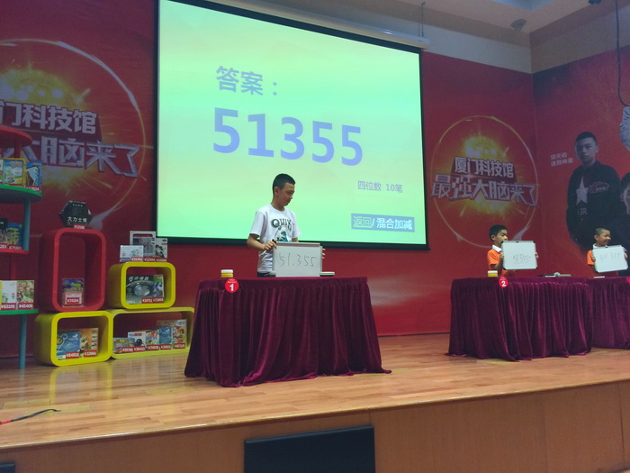 5月1日至3日,廈門科技館與廈門晚報聯(lián)合主辦的《最強大腦來了》公益活動如期舉行。網(wǎng)絡票選人氣最高的三位“最強大腦”—— “亞洲腦王”王峰、“速算神童”項天佑和“魔方機器人”孫虹燁在廈門科技館為市民奉上3天6場 “燒腦”斗智大戲。