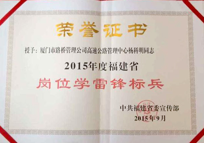 會議命名了2015年度全省十個學雷鋒活動示范點和十個崗位學雷鋒標兵。路橋管理公司員工楊科明獲評“全省崗位學雷鋒標兵”,系廈門市唯一獲此榮譽的職工。